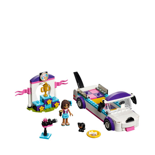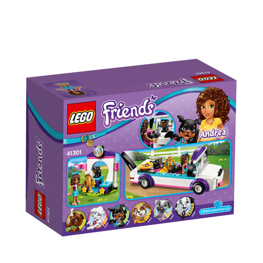 Kör valplimousinen med de söta hunddetaljerna och plats för alla LEGO® Friends valpar som du har samlat. Anländ till prispallen för att ge Apollo guldpokalen, och filma allt med tv-kameran med Andrea vid mikrofonen. Innehåller en minidocka och en hundfigur.