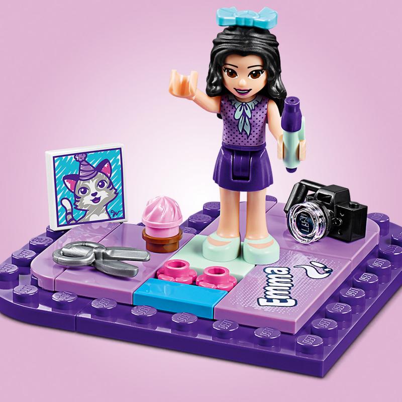 LEGO Friends Emma älskar att skapa saker och allt i hennes hjärtformade ask speglar hennes kreativa personlighet, till exempel en kamera, ett ritblock och en penna. Hon har också med sig en sax så att hon är redo att göra om sina kläder vart hon än beger sig. Den här samlarleksaken är ett reseset, där allt får plats i hjärtasken och locket håller alla delar på plats. Ta av locket och använd det som en stadig plattform för Emma – perfekt för rollekar på resande fot! Innehåller minidockan Emma.