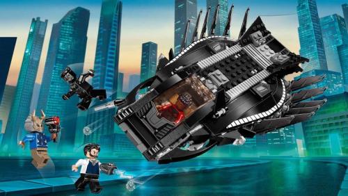 Large Exempel 76100 Attack med kungligt klojaktplan. Hjälp Black Panther i den sista striden mot Killmonger! Klättra in i cockpit på det kungliga klojaktplanet med Nakia och susa upp mot natthimlen. Avfyra knoppkanonerna mot Killmonger och Ulysses Klaue, och landa sedan med det grymma luftskeppet. Attackera med Nakias skivblad, undvik Killmongers missiler och fånga superskurken i klojaktplanets fängelse! Antal LEGO bitar 358. Rekommenderad Ålder 7-14 år.