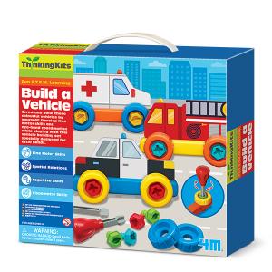 Lek & Lär - Bygg ett Fordon, Barnen kan designa och bygga själva med sina egna händer och med hjälp av specialanpassade verktyg. När de bygger den färgglada bilen och sätter hjulen på plats så tränar de sin finmotorik och ögon-hand-samordning, när allt är på plats så kanske fordonen får en chans att tävla mot varandra. 4+